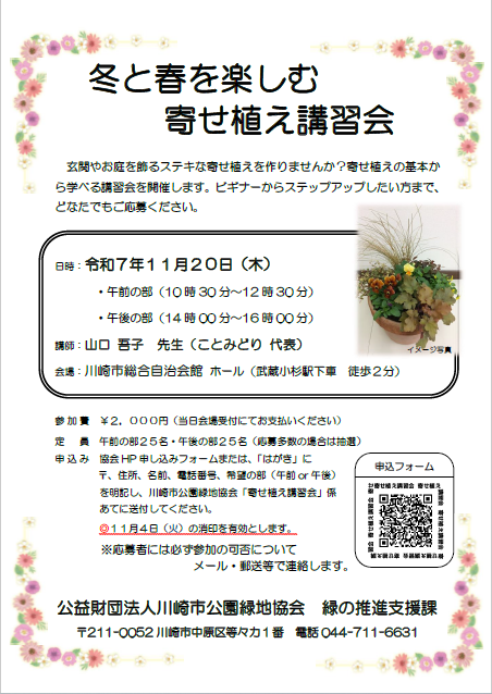 「冬と春を楽しむ寄せ植え講習会」申込フォームこちらから入力画面に入れます玄関やお庭を飾るステキな寄せ植えを作りませんか?寄せ植えの基本から学べる講習会を開催します。ビギナーからステップアップしたい方までどなたでもご応募いただける講座です。