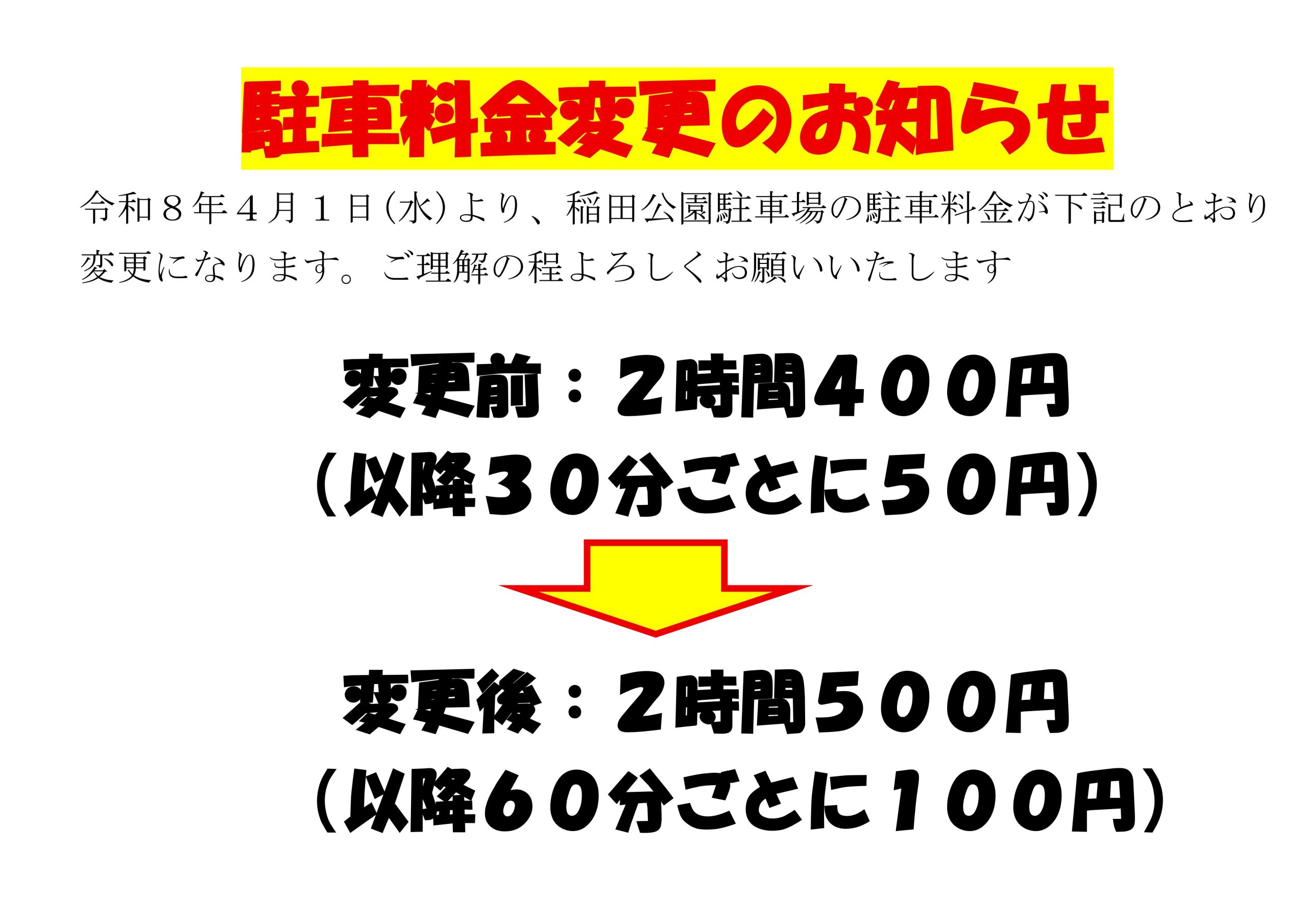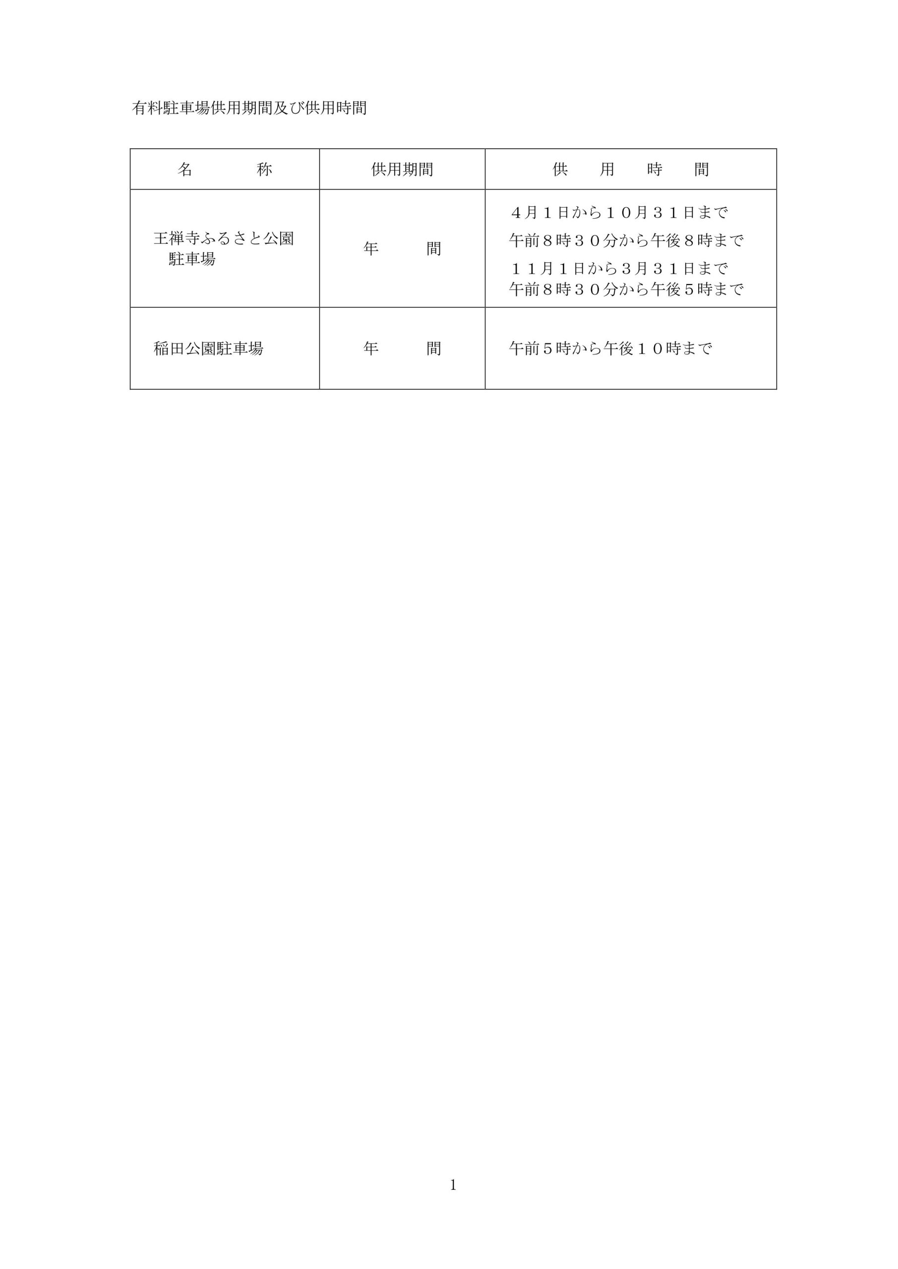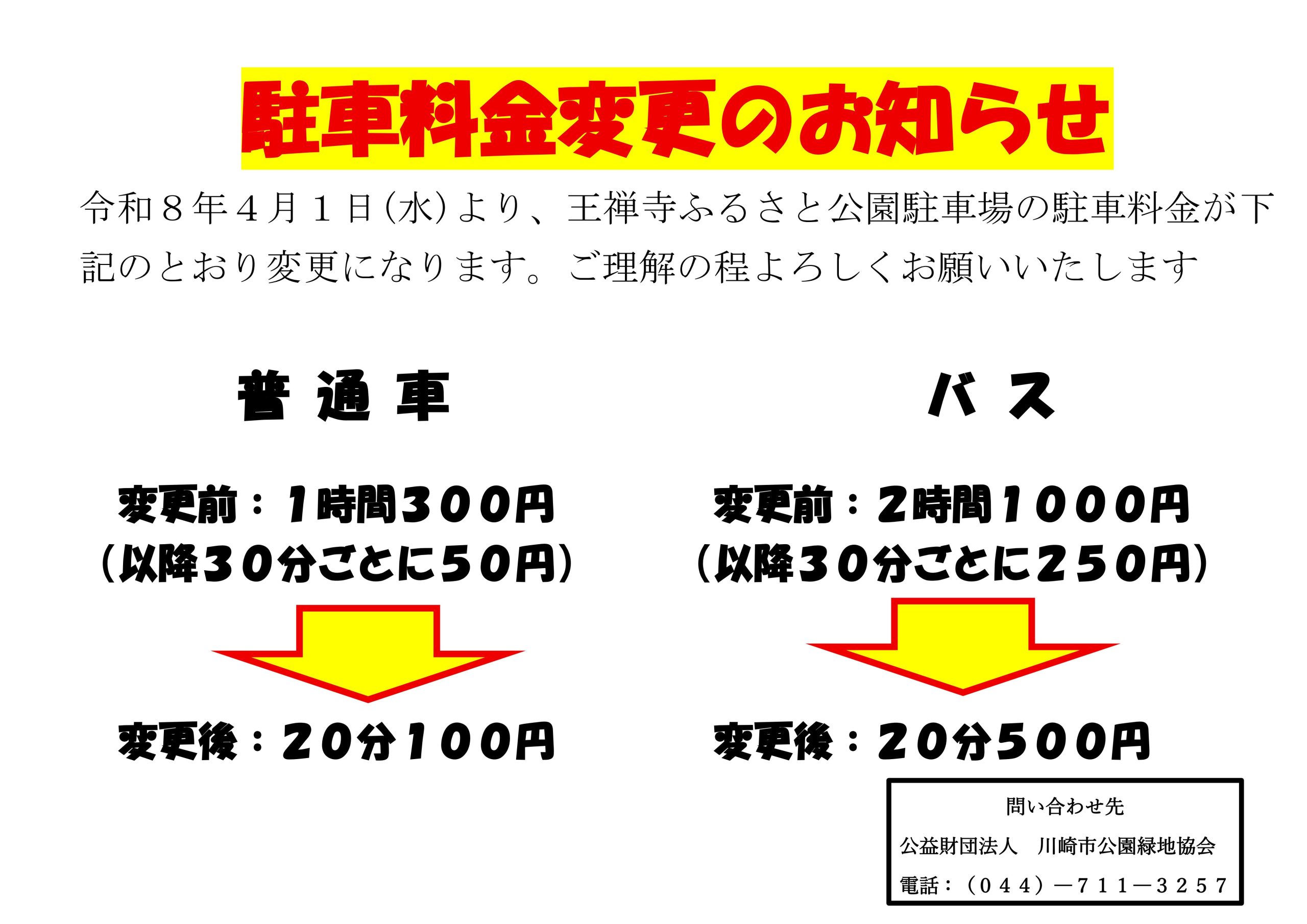 令和8年4月1日より王禅寺ふるさと公園駐車場、稲田公園駐車場の駐車料金が変更となります。